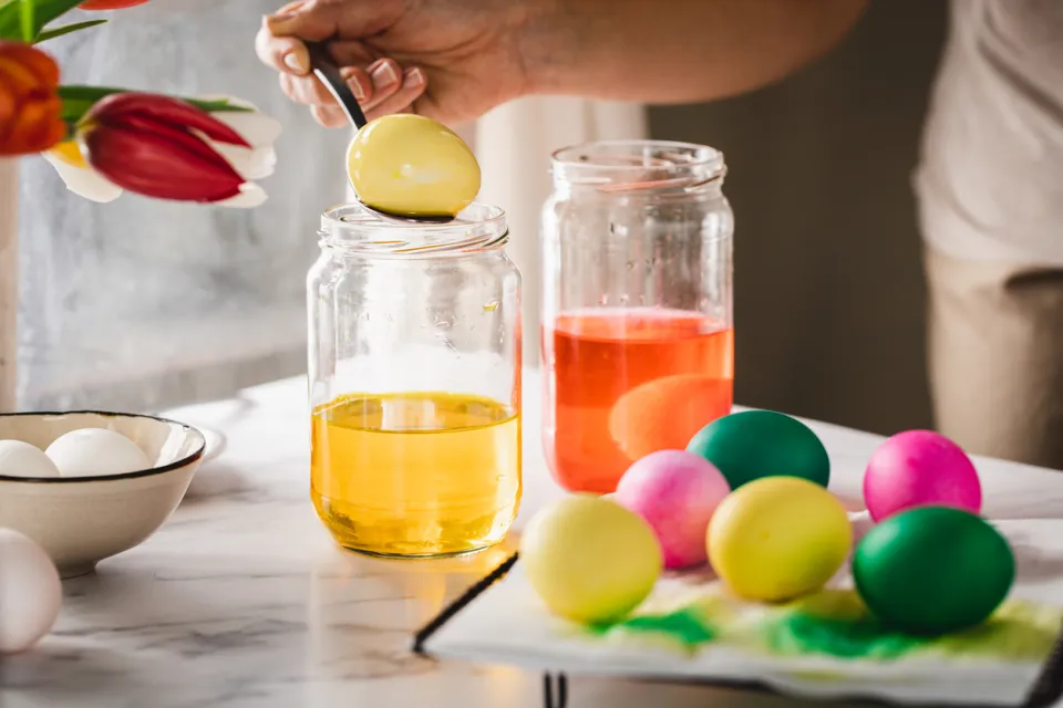 - Plonger les œufs dans les bains de couleur pendant 5 à 10 minutes, selon l’intensité désirée.
